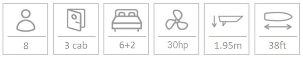 Architect: Felci Yachts Hull length : 9.99 m Max beam : 3.54 m Light displacement : 5775 Kg Draft : 1.90 m Keel weight : 1550 Kg Fuel tank capacity : 160 L Water tank capacity : 220 L Engine power : 29 hp Sail area : 55 m² Main Fullbatten : 34.50 m² Genoa : 25.50 m²